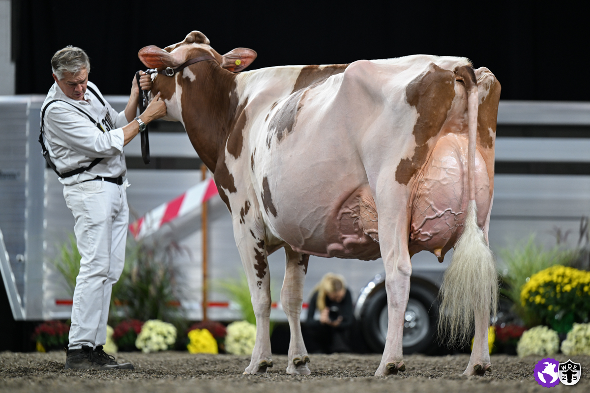 It was almost Premium Apple Crisp Lilly-Red who took home the Grand Champion title for the third time in a row at the International Red & White Show, last weekend in Madison! The Apple Crisp daughter of Butlerview Farm won the Grand Champion title at the World Dairy Expo in 2024 & 2023! This year she won her class with Aged Cows, 6 Years old & Older, the R&W Reserve Senior Champion title and the Reserve Grand Champion title. It was Golden-Oaks Temptres-Red EX-94-USA that was named as Grand Champion of the International Red&White Show by judge Adam Hodgins and associate Joel Phoenix! Temptres-Red is an Unstopabull-Red daughter, owned by Milk Source, Fischer, Steincrest & Crescentmead, Kaukauna, Wisconsin and is straight out of Miss Pottsdale DFI Tang-Red EX-94-USA. She is the Defiant *RC daughter who was Honorable Mention Senior Champion Midwest Spring National R&W Show 2019 and more!