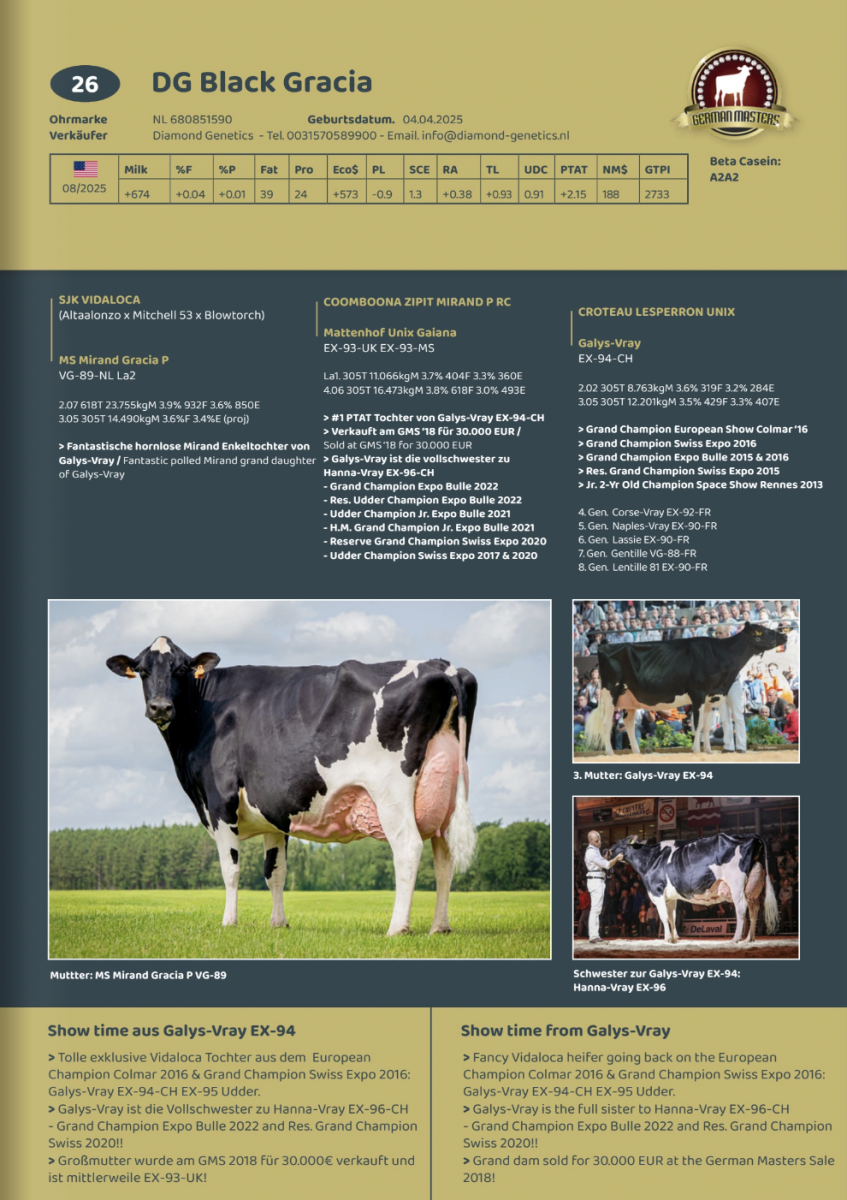 Diamond Genetics is selling their very best at the German Masters Sale 2025, taking place this friday (October 17) at the RUW in Fliessem, Germany. They sell a fancy Vidaloca daughter as Lot 26 from MS Mirand Gracia P VG-89-NL La2. Gracia P VG-89 La2. is a fantastic polled Mirand PP *RC grand daughter to Galys-Vray EX-94-CH. Galys-Vray EX-94 has an amazing victorylist with winning Grand Champion European Show Colmar 2016, Grand Champion Swiss Expo 2016, Grand Champion Expo Bulle 2015 & 2016, Res. Grand Champion Swiss Expo 2015 and more! Galys-Vray EX-94 is the full sister to the Grand Champion Expo Bulle 2022 & Res. Udder Champion Expo Bulle 2022: Hanna-Vray EX-96-CH.
