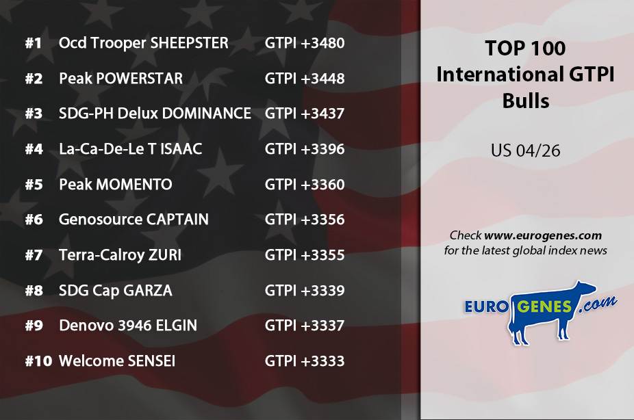 Ocd Trooper Sheepster holds the lead in the United States this week in the ranking with International GTPI bulls! He added 1915 daughters to his US-index and notes +3480 GTPI with +1359kgM, +0.28%F and +0.08%P. Also Sheepster his sons had a good proof, with for example Hi-Note at +3527 GTPI of Beyond Shpstr Golley at +3511 GTPI. New at the second spot is Peak Powerhouse, an AltaWheelhouse son with 260 daughters in his index, +3448 GTPI with +1029 NM$, +1937kgM, +0.12%F, +0.10%P and +1.1 SCE. Making the top 3 complete with SDG-PH Delux Dominance. Deluxe x Pursuit son Dominance has 804 daughters in his index, +3437 GTPI, +1303kgM, +0.29%F, +0.08%P and +1127 NM$. A great debut for Captain son Gen Percival in this ranking. He has 166 daughters in his US-index and guarantees +3202 GTPI. Percival had also a great debut in Italy with daughter proven sires, he came in as the Nr. 2 gPFT sire!