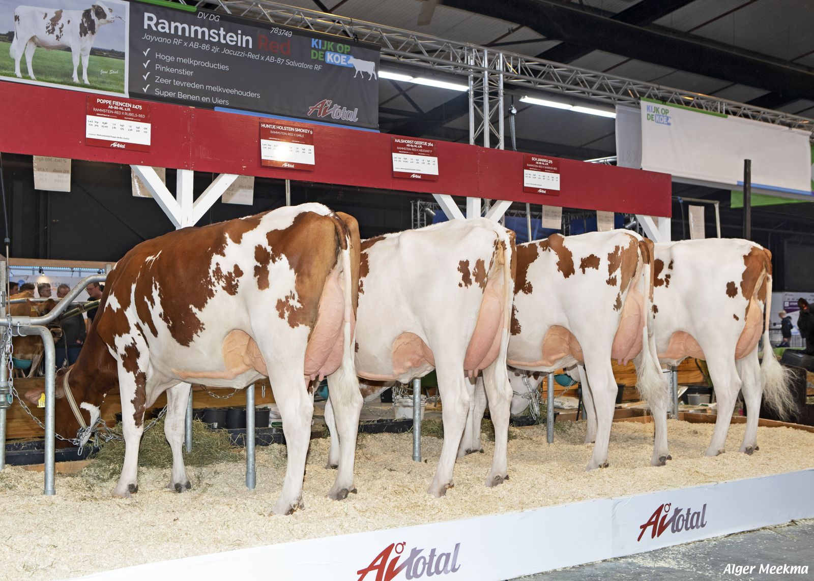 During the RMV in Hardenberg, the Netherlands AI-Total presented a progeny group of four DV DG Rammstein-Red daughters. They showed an uniform group with huge production and a lot of youth. DV DG Rammstein-Red is a Jayvano *RC son from a VG-86 2yr. Jacuzzi-Red daughter from Lakeside Ups Rosylane VG-87-NL VG-88-MS. She is a Salvatore *RC daughter and full sister to the Red Impact Cow 2021 Lakeside Ups Red Range VG-86-NL 2yr. Red Range VG-86 has 15 sons in AI, with for example Ranger-Red, Koepon OH Relax-Red, Koepon Rigoletto and more! DV DG Rammstein-Red is bred by Diamond Genetics & De Volmer Holsteins and goes back on the Golden-Oaks Mark Prudence EX-95-USA family.
