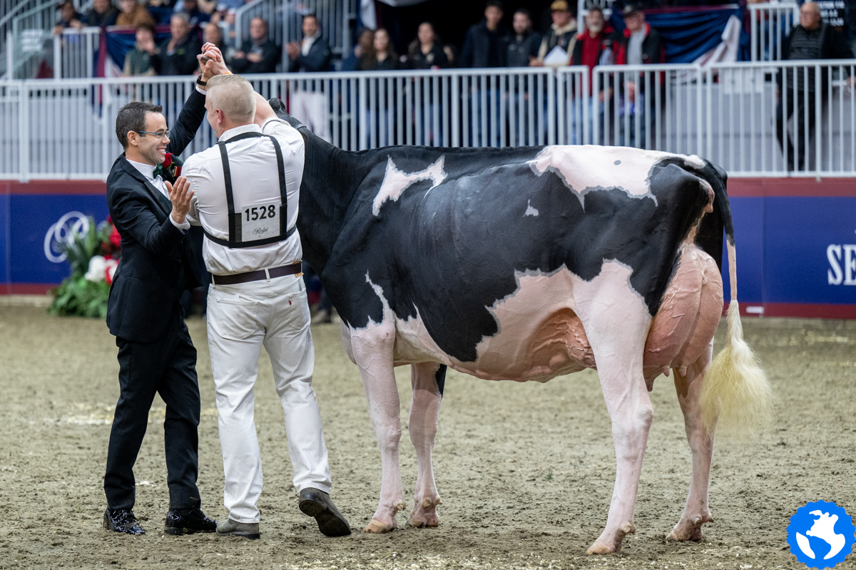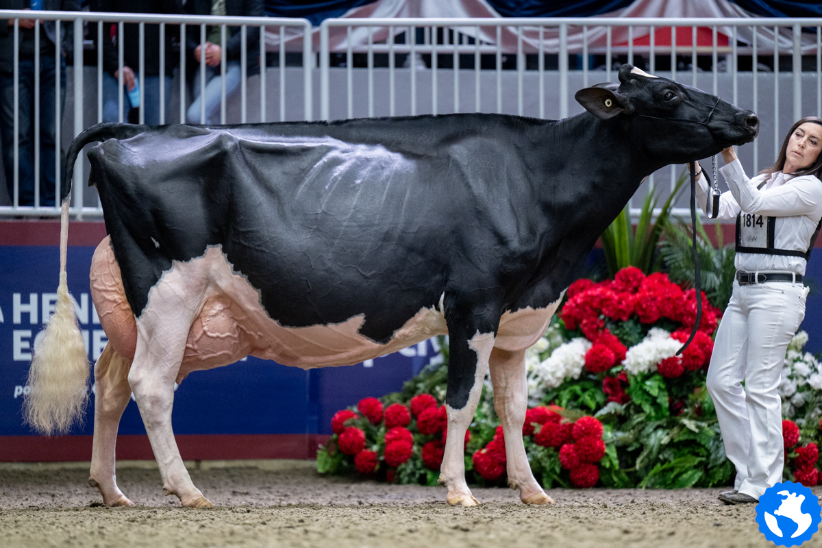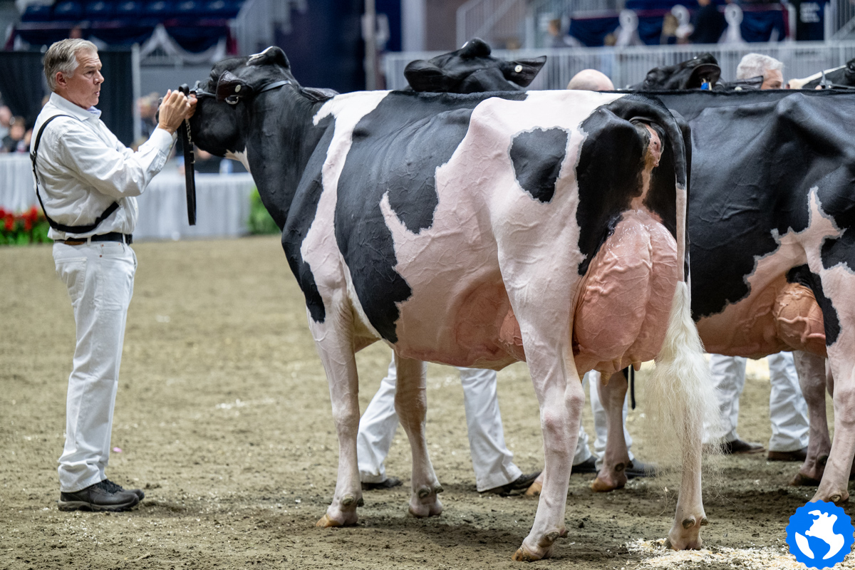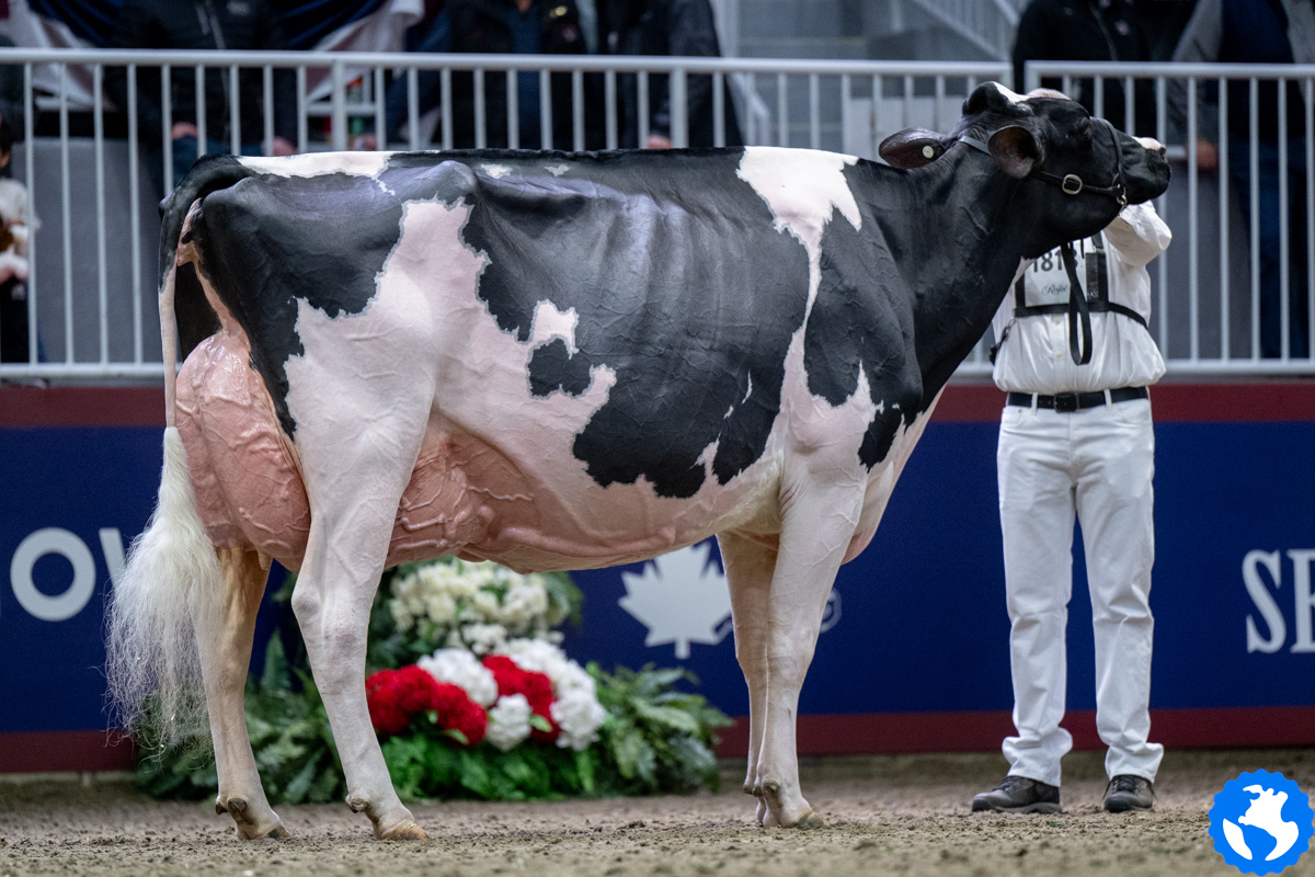 Unix daughter Altona Lea Unix Herminie, exhibited by Dalton Faris, East Gwillimbury, Ontario has been crowned by judge Joel Lepage and Associate Judge Jean-Philippe Proulx as the new Grand Champion of the Royal Winter Fair 2025. In second follows Eixdale Pwrup Alongside with the Reserve Grand Champion title at the Royal Winter Fair. The Alongside daughter from Milksource Genetics, Kaukauna, Wisconsin was Reserve Senior Champion last month at the World Dairy Expo. West-Adub Lambda Sadie won the H.M. Grand Champion title after winning the Intermediate Champion ribbon earlier that day and her class with Jr. 3yr. olds.