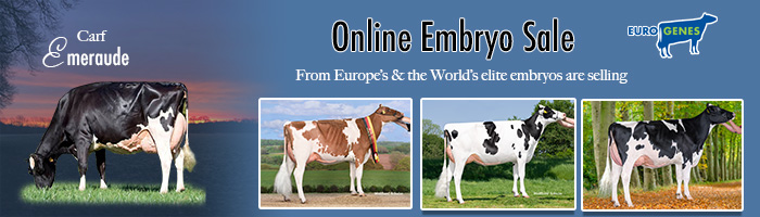 9 januari 2026 Een gloednieuwe editie van de Eurogenes Online Embryo Sale is zojuist gestart. Meerdere interessante embryo pakketten zijn toegevoegd aan deze eerste editie van 2026 van de Online Embryo Sale. Bied als laatste op 1 van deze embryopakketten met bijvoorbeeld Vrouwelijke Mountie-Red (+3008 GTPI / +2.53 PTAT) embryo's uit MS Latenite Sugar Mummy P Red. Zij is een hoornloze en roodbonte Latenite P kleindochter van Blondin Redman Seisme EX-97, de 3x Grand Champion World Dairy Expo. Of vrouwelijke Haveitall Blakely Hinge (+3242 GTPI / +2.80 PTAT) embryo's uit Sunibelle Dempsey Esprit EX-96-CH haar Arrow kleindochter kunnen van u worden! Esprit EX-96 heeft een prachtige lijst met overwinningen, waaronder Kampioen Oudere Koeien en Grand Champion Swiss Expo 2024. Bied als laatste op Aurora Howland P (+3348 GTPI / +1.56 PTAT) embryo's uit Broeklander HiPo H Liza, een Harold P dochter met +3143 GTPI en meerdere 'herdbuilding' pakketten. Klik verder voor meer info. Lees meer