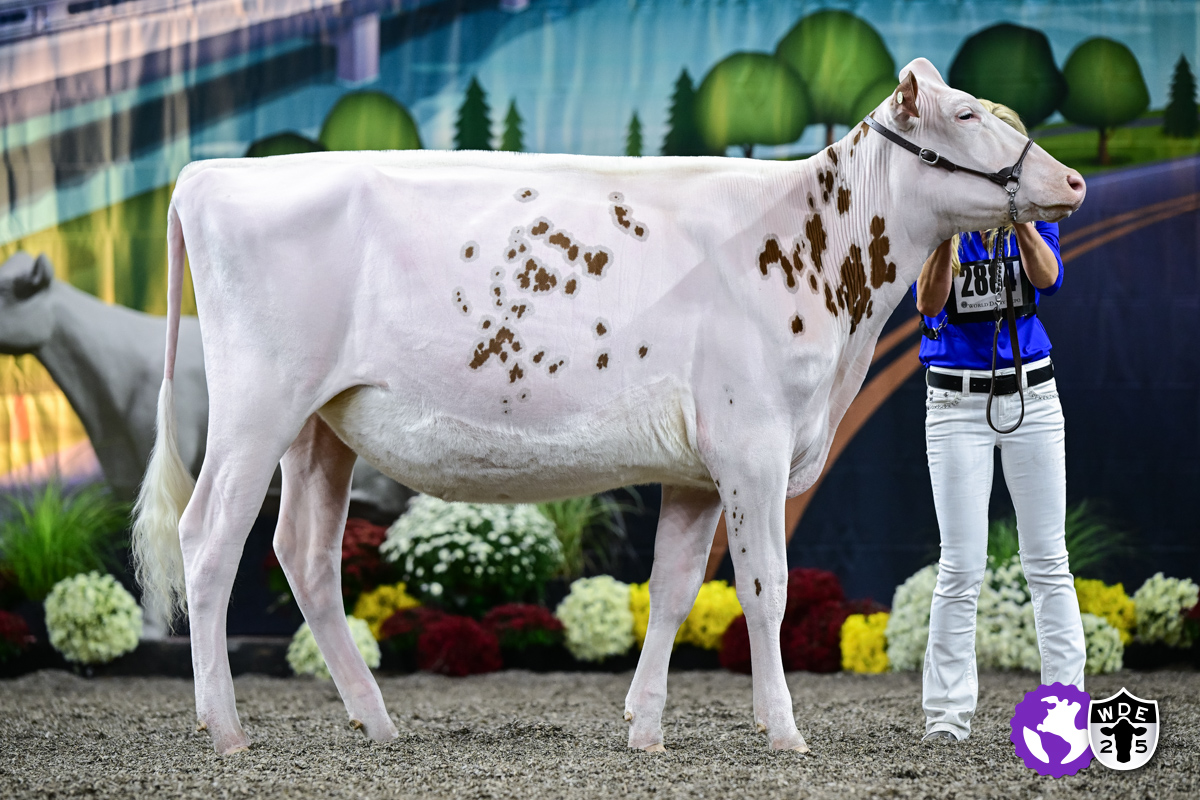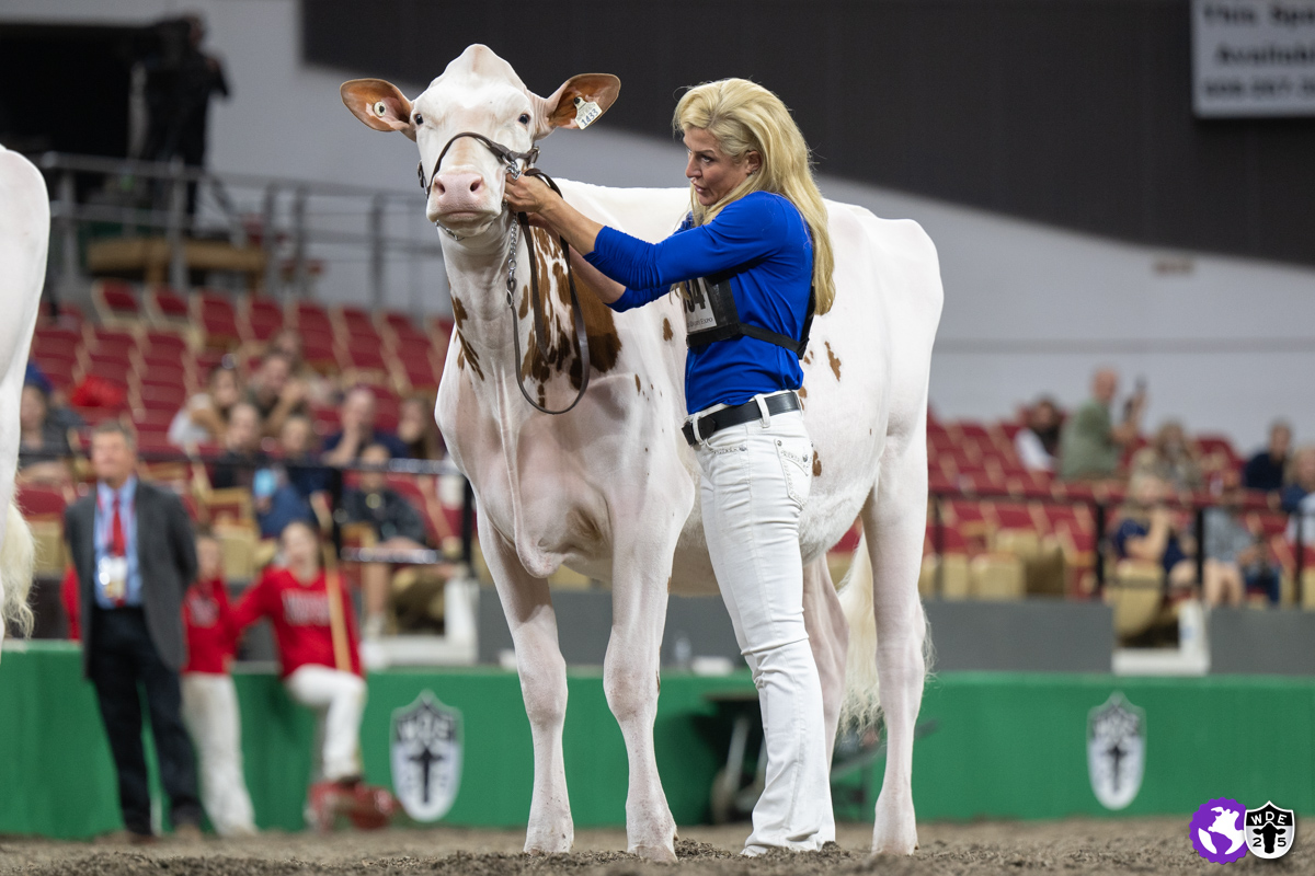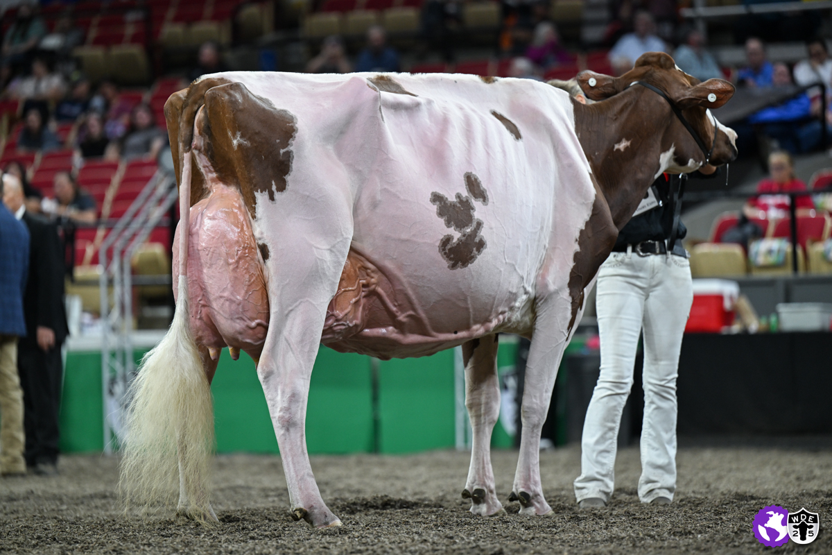 It was almost Premium Apple Crisp Lilly-Red who took home the Grand Champion title for the third time in a row at the International Red & White Show, last weekend in Madison! The Apple Crisp daughter of Butlerview Farm won the Grand Champion title at the World Dairy Expo in 2024 & 2023! This year she won her class with Aged Cows, 6 Years old & Older, the R&W Reserve Senior Champion title and the Reserve Grand Champion title. It was Golden-Oaks Temptres-Red EX-94-USA that was named as Grand Champion of the International Red&White Show by judge Adam Hodgins and associate Joel Phoenix! Temptres-Red is an Unstopabull-Red daughter, owned by Milk Source, Fischer, Steincrest & Crescentmead, Kaukauna, Wisconsin and is straight out of Miss Pottsdale DFI Tang-Red EX-94-USA. She is the Defiant *RC daughter who was Honorable Mention Senior Champion Midwest Spring National R&W Show 2019 and more!