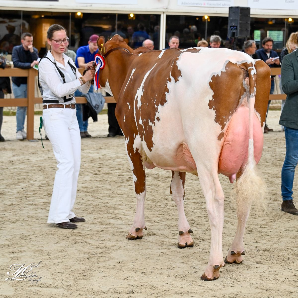 An amazing Eurogenes Online Embryo Sale result: Batouwe Mirand Alnika P Red! This Red & White Mirand PP *RC daughter became last weekend 2yr. old champion at the first edition of the National Red & White show. Alnika P Red is sold as embryo through the Eurogenes Online Embryo Sale to Batouwe Holsteins and sold as heifer through the Schouten & Partners Holstein Sale 2022 to KOEster. She is a Mirand PP *RC grand daughter to the Royal Winter Fair Classwinner Deslacs Talent Alyana Red EX-92-CAN EX-95-MS 2E and great grand daughter of the 2007 Grand Champion Royal Winter Fair Toronto: Parile Kite Alicia EX-90-CAN! Alnika P Red her dam, Declas New Alicia Red VG-89-NL 2yr. will be in flush program soon, reservations for embryos can be made now - CLICK HERE for more info.! Congratulations to the Bakker family and to KOEster with this special R&W 2yr. old!