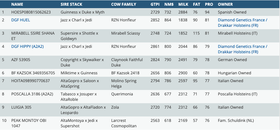 Today it's time for a great ranking on the trait PROTEIN based on the GTPI index!! We'll introduce you the top 10 PROTEIN females in Europe of the December 2021 proof! The #1 PROTEIN female in Europe is a Spanish owned Guinness daughter at +94 lbs Protein. In second follows the former #1 Female Protein: DGF Huel. This Jazz daughter out of Charl daughter DGF W Hana (BB) has +81 lbs Protein in combination with +90 lbs Fat and +1838 lbs Milk and is backed by Lookout Pesce Epic Hue. At the shared second spot we find an Italian owned Supersire daughter with also +81 lbs Protein. Making this top three complete is DGF Hippy (A2A2), she is sister to DGF Huel at +79 lbs Protein in combination with +2491 lbs Milk.