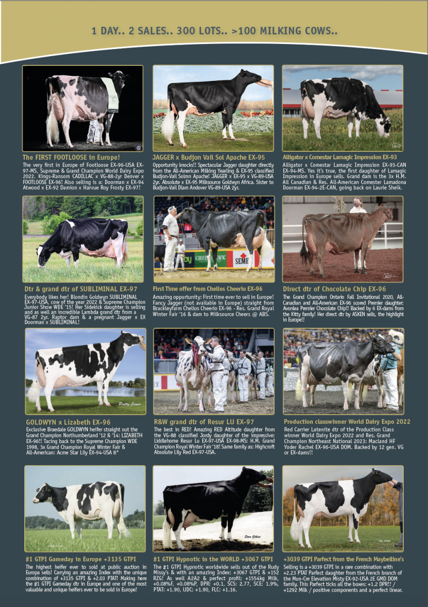 One of the greatest LIVE sales on the European auction agenda will take place on Friday, the 20th of October 2023: THE GERMAN MASTERS SALE together with the Nosbisch Holsteins Dispersal! One of the most UNIQUE auctions Europe ever had > 1 Day.. 2 Sales.. 300 Lots.. >100 Milking Cows.. Selling are all milking Cows +- 150 head youngstock from the world famous Nosbisch Holstein Herd! Topped by 50 amazing Lots of the 10th edition of the German Masters Sale 2023!!