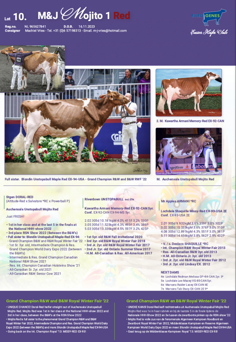 The full sister to Blondin Unstopabull Maple EX-94-USA is just FRESH and looks promising! Maple EX-94 is the Grand Champion B&W and R&W Royal Winter Fair 2022, Intermediate Champion (between the B&W's) & Res. Grand Champion World Dairy Expo 2022 and won multiple titles more! The fresh 2yr. old: Auchensala Unstopabull Mojito Red was 1st in her class with heifers at the national HHH-Show 2022 and at the last 5 in the finals! She is straight out of Armani *RC daughter Kawartha Armani Memory-Red EX-92-CAN 5yr., the classwinner 5yr. old R&W Fall Invitational 2020 & 3rd 3yr. old R&W Royal Winter Fair 2018 and is out of the Intermediate Champion Royal Winter Fair 2013: Lochdale Shaquille Missy-Red EX-93-USA 2E. Auchensala Unstopabull Mojito Red her fancy Doral-Red daughter sells next week in the Online Easter Heifer Sale as Lot 10!