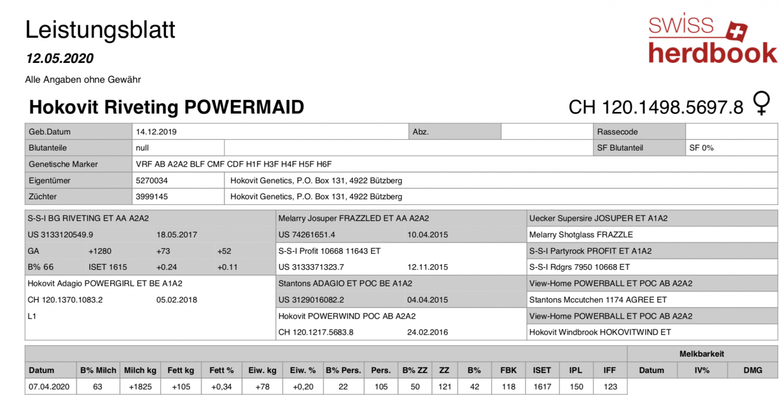 Hokovit POWERALL P, one of Hokovit Genetics latest releases, is in the top 4 ISET sires in the Swiss system. He notes profitable 1511 ISET and available at Swissgenetics since January. He has many more to offer you: +0.30% Protein, Kappa Casein BB, POLLED and a huge cow family tracing back to the queen of the breed: C Glenridge Citation Roxy EX-97-USA 4E GMD! His dam Hokovit Powerwind GP-83-CH 2yr. is doing well in her second lactation and currently projected with 12.500kgM 3.91%F 3.41%P in 305 days. The daughter of POWERALL P his maternal sister: Hokovit Powermaid notes +1617 ISET and 150 IPL and belongs to the absolute top ISET heifers in Switzerland!