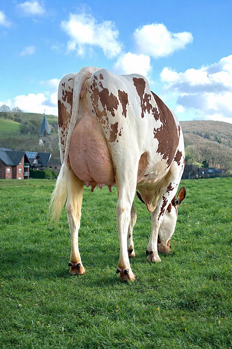 She belongs to one of the first milking daughter of DV DG Rammstein-Red in Germany: SfH Rammstein Rabiosa. This fabulous Red & White is now 270 days in her 1st lactation and has still a milkproduction of 41kgM / day with 5.1% Fat and 3.7% Protein! She is sired by DV DG Rammstein-Red @ AI-Total, he is the Nr. 2 R&W daughter proven sire in Germany at +145 RZG and by far the Nr. 1 R&W daughterproven sire in the Netherlands at +369 NVI! DV DG Rammstein-Red is a Jayvano *RC son from a VG-86 2yr. Jacuzzi-Red daughter from Lakeside Ups Rosylane VG-87-NL VG-88-MS. She is a Salvatore *RC daughter and full sister to the Red Impact Cow 2021 Lakeside Ups Red Range VG-86-NL 2yr. Red Range VG-86 has 15 sons in AI, with for example Ranger-Red, Koepon OH Relax-Red, Koepon Rigoletto and more! DV DG Rammstein-Red is bred by Diamond Genetics & De Volmer Holsteins and goes back on the Golden-Oaks Mark Prudence EX-95-USA family.