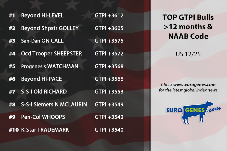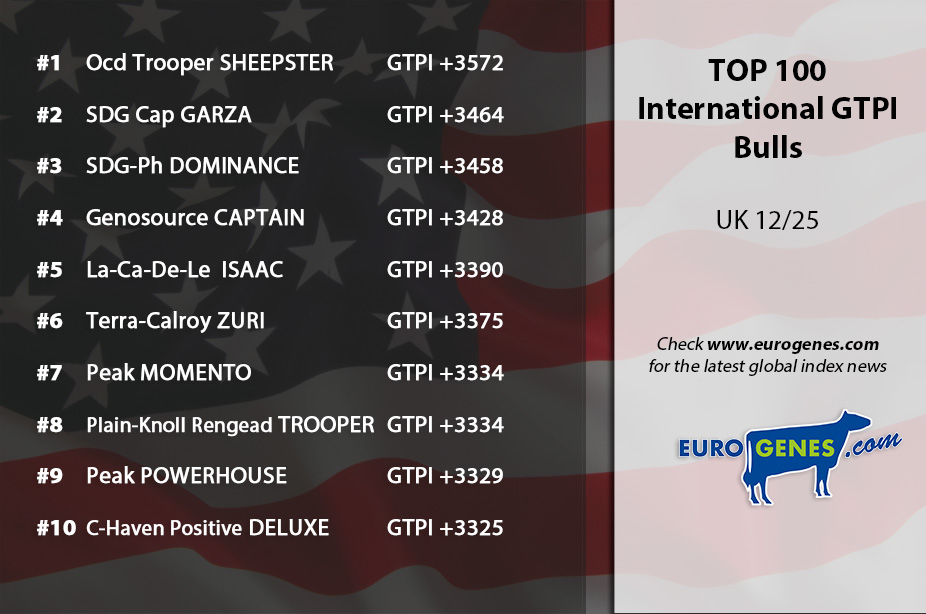 A new charttopper this December 2025 run in top 100 with International GTPI bulls with the influential Ocd Trooper Sheepster at +3572 GTPI. He is sired by Trooper, who we can find at the 7th spot in this ranking at +3334 GTPI. Sheepster added 366 daughters to his index and raised his GTPI score with +114 to +3572 GTPI with +1521kgM, +0.25%F and +0.07%P. Sheepster his first sons are ranking over the >3600 GTPI in combination with >1.50 PTAT! In second follows this run SDG Cap Garza at +3464 GTPI and making the top 3 complete with SDG-PH Delux Dominance at +3458 GTPI.