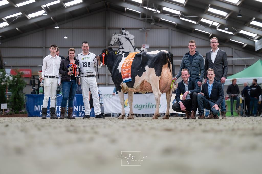 It was a sucessful day for van der Eijk Holsteins at the Wintershow Middenmeer '23. Anya 10 (s. Mogul) became 1st in her class with Intermediate cows and was crowned as Reserve Intermediate Champion. As 2yr. old she is classified with VG-88-NL 2yr. with VG-89 for her Mammary System. Her dam is Gold Chip daughter Bolleholster Anya 4 EX-92-NL EX-92-MS. She was Intermediate Champion Dairy Show Opmeer 2019 and Intermediate Champion, Udder & Grand Champion North-Holland Summer Show 2021. Anya 4 EX-92 her dam is maternal sister to Eclipse Atwoods Archrival. The Intermediate Champion title of the Wintershow Middenmeer 2023 was for Mps Prosy Prosi (s. Sidekick). The 2yr. old Champion title was for Moovin *RC daughter Future Dreams H. S.J.K. Annemoon, owned by S.J.K. (Fam. Kat). Her Doorman dam is sold at the Holland Masters Sale 2017. Atwood daughter Sonja 58 became Grand Champion and Senior Champion of the show.