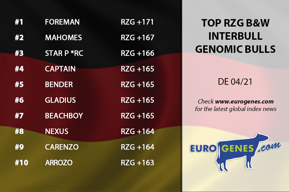 A solide April 2021 proof for Cogent Supershot son Topshot at +165 RZG with >6.100 daughters. Topping the daughter proven sire list is Semino (s. Silver) at +159 RZG. Either Supershot son Moonglow follows in second with +157 RZG and >1.800 daughters. The #1 RZG genomic sire is Broeks Freemax son Foreman at +171 RZG!! In second follows Eldorado son Mahomes at +167 RZG. Either in the top five we find the former #1: Captain at +165 RZG (shared 4th spot). Remarkable is the #1 R&W daughter proven bull in Germany: Effektiv (s. Effort) at +145 RZG. The #1 RZG Red & White genomic sire is OH DG Rubels-Red son Flight-Red at +165 RZG. Click further for the complete German rankings.
