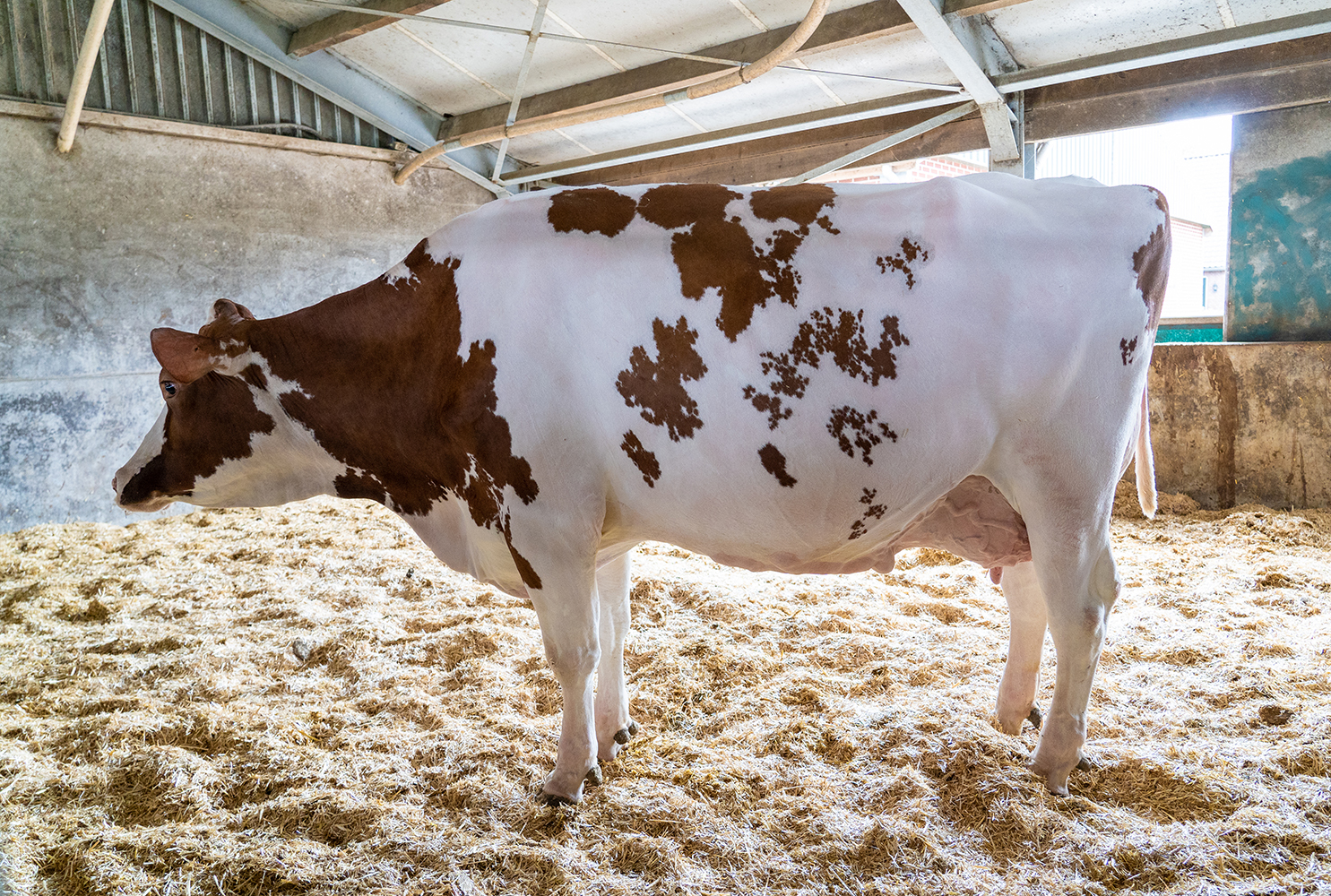 During the RMV in Hardenberg, the Netherlands AI-Total presented a progeny group of four DV DG Rammstein-Red daughters. They showed an uniform group with huge production and a lot of youth. DV DG Rammstein-Red is a Jayvano *RC son from a VG-86 2yr. Jacuzzi-Red daughter from Lakeside Ups Rosylane VG-87-NL VG-88-MS. She is a Salvatore *RC daughter and full sister to the Red Impact Cow 2021 Lakeside Ups Red Range VG-86-NL 2yr. Red Range VG-86 has 15 sons in AI, with for example Ranger-Red, Koepon OH Relax-Red, Koepon Rigoletto and more! DV DG Rammstein-Red is bred by Diamond Genetics & De Volmer Holsteins and goes back on the Golden-Oaks Mark Prudence EX-95-USA family.
