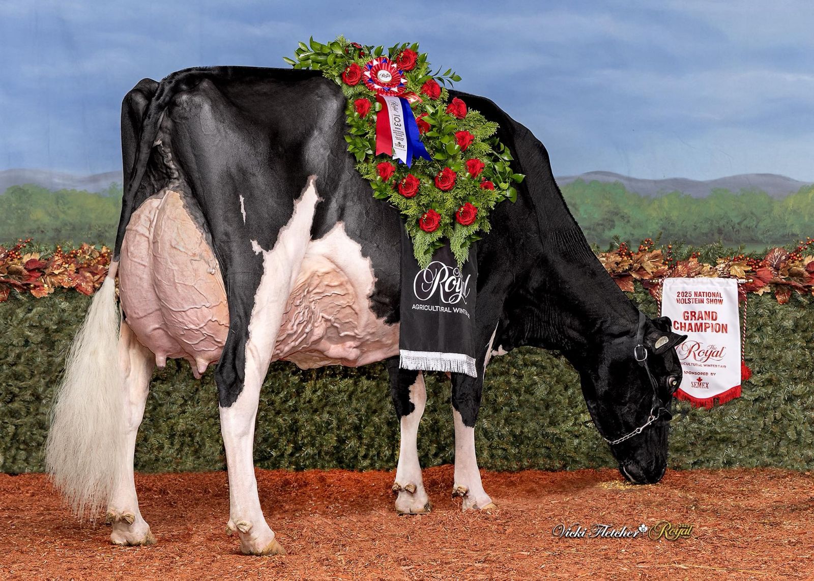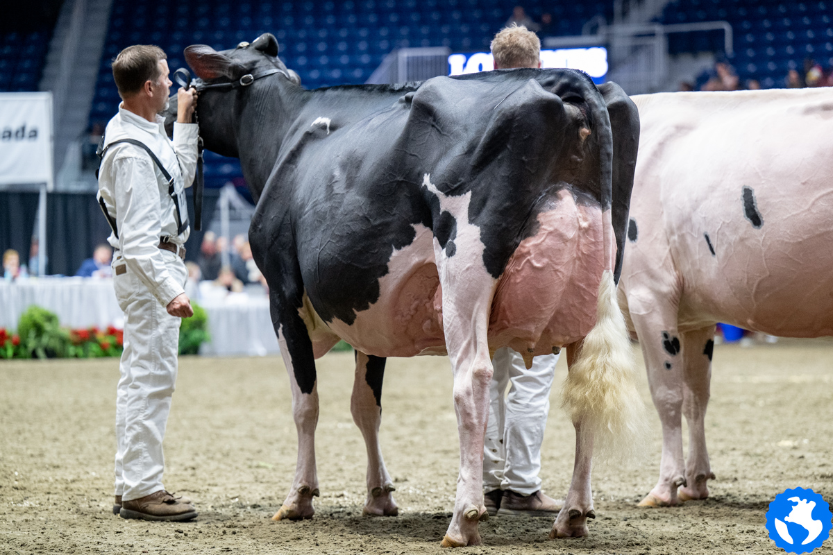 Unix daughter Altona Lea Unix Herminie, exhibited by Dalton Faris, East Gwillimbury, Ontario has been crowned by judge Joel Lepage and Associate Judge Jean-Philippe Proulx as the new Grand Champion of the Royal Winter Fair 2025. In second follows Eixdale Pwrup Alongside with the Reserve Grand Champion title at the Royal Winter Fair. The Alongside daughter from Milksource Genetics, Kaukauna, Wisconsin was Reserve Senior Champion last month at the World Dairy Expo. West-Adub Lambda Sadie won the H.M. Grand Champion title after winning the Intermediate Champion ribbon earlier that day and her class with Jr. 3yr. olds.